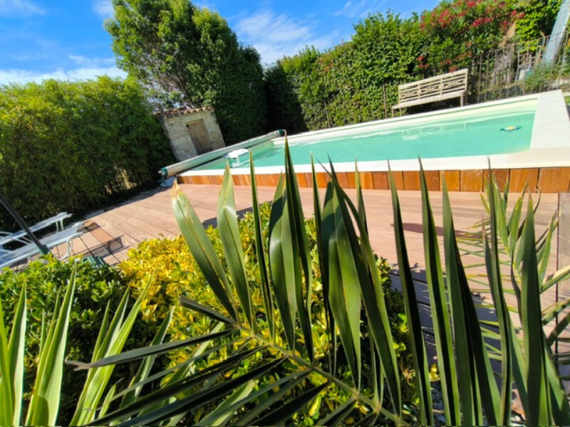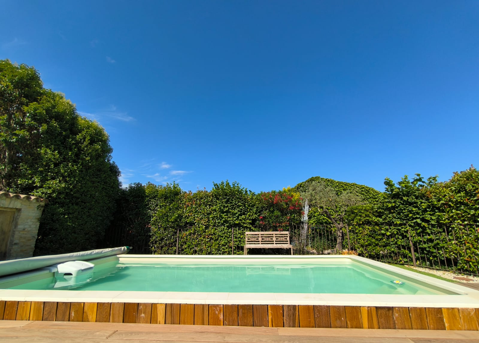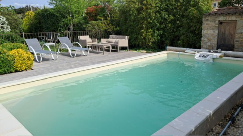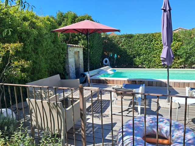 Belle piscine desjoyaux de 6 x 3.5 avec plage en bois ,abri pour 2 voitures et grand atelier.