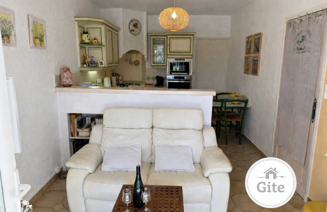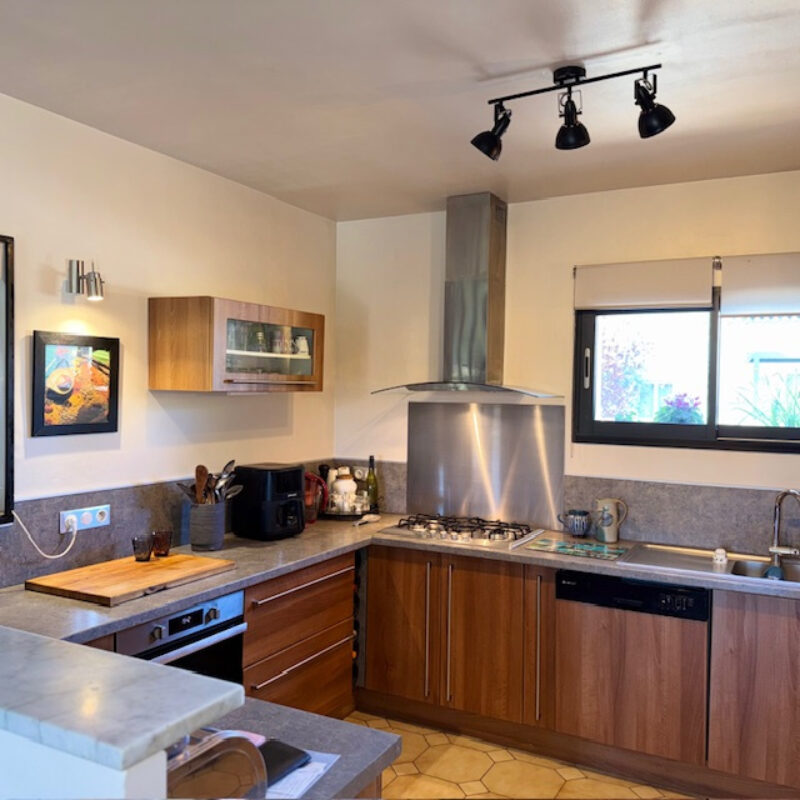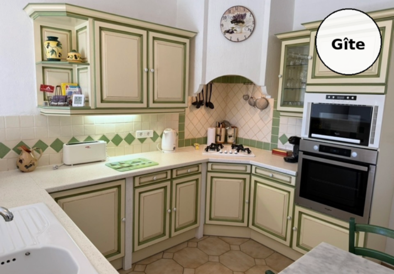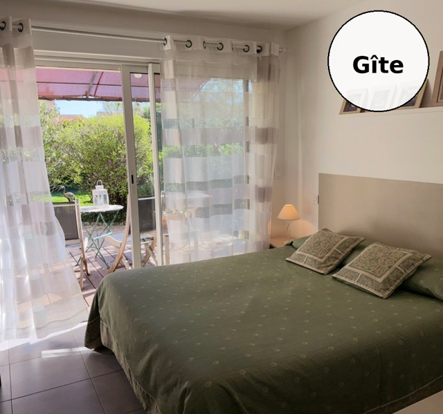 Dans le gîte: pièce à vivre avec cuisine équipée, wc , salle d’eau ,chambre avec terrasse privative et bureau.Vous avez besoin d’une suite parentale en rdc ? Vous pouvez recréer l’ouverture avec le gîte qu’il y avait à l’origine.