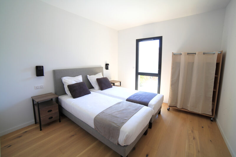 Les 3 grandes chambres sont toutes équipées de salle d’eau, de grande penderie et de literie de qualité ( 2 x80 ).Une des chambres est accessible et aménagée pour les personnes à mobilité réduite avec une penderie amovible et des sommiers électriques.